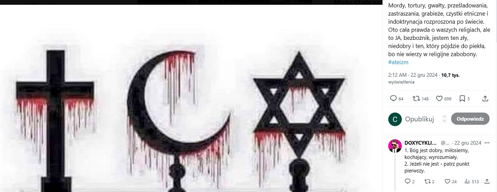 20.03.2025nr 079 (7172 ) ISSN 1734-6827 Hyde Park Corner Temat: Niech bêdzie pochwalony.... Autor: WIARUS godzina: 12:51 Niech bêdzie pochwa W zwi±zku z gwa³townym i nag³ym wzmo¿eniem ortodoksów KK z pewn± doz± zawstydzenia przyznajê, ¿e nie wszystko w Biblii jest popieprzone - numeracja stron jest w porz±dku ;-))) Zaparzcie sobie kawê i na spokojnie analizujcie tre¶æ poni¿szego obrazka przywo³uj±c z pamiêci albo z literatury fakty historyczne! ![]() Autor: J.Chudy godzina: 19:33 Postaram siê w bardzo prosty sposób. Mo¿e na kierowcach. Je¶li kierowca jest alkoholikiem - jest niemal pewne, ¿e straci prawo jazdy. Klecha - przeniesiony zostanie do innej parafii. Liczne zamiatanie ich przestêpstw przez KK, a i w³adze, powoduje to, ¿e tacy, jak Ty twierdz±, ¿e zboków w KK nie jest wiêcej ni¿ w innych ¶rodowiskach. Nawet rodzice molestowanych przez ksiê¿y dzieci staraj± siê to zatajaæ. S± te¿ przypadki, ¿e dziecko jest "winne" temu, ¿e ksi±dz je zgwa³ci³. Czytaj, jest tego du¿o. Nie musisz chwaliæ siê t± wiedz±, tylko b³agam - nie pisz, ¿e to jest normalne, ¿e ich to tylko statystyka. Autor: bfgj godzina: 19:41 Twoja "religia" zwana "komunizmem" czy "lewactwem" jak kto woli jest pod tym wzglêdem jeszcze gorsza. Pod wzglêdem rozlewu krwi, morderstw, masowych egzekucji i ludobójstwa nic nie jest w stanie przebiæ komunizmu. Widzisz czyje¶ pod lasem nie widzisz swojego pod nosem. Pomódl siê do Lenina bêdziesz mia³ lepsze samopoczucie. Zbli¿a siê rocznica urodzin Lenina. Za³ó¿ garnitur. Autor: bfgj godzina: 21:21 @J.Chudy "Je¶li kierowca jest alkoholikiem - jest niemal pewne, ¿e straci prawo jazdy" A kto odbierze mu to prawo jazdy? Policja, s±d. Napewno nie przyczyni siê do tego inny kierowca ,czy kierowca z jego rodziny, Statystyki mówi± ¿e przekazywanie policji o pijamnych kierowcach przez innych kierowców , czy bliskich to znikomy procent, ¯ony z dzieæmi wsiadaj± do samochodów z pijanym mê¿em kierowc± i nie donasz± na policjê. Pó¼niej zamiataj± to pod dywan chroniac pijaka mê¿a. "Klecha - przeniesiony zostanie do innej parafii. Liczne zamiatanie ich przestêpstw przez KK" W tym wypadku chcesz aby ¶rodowisko ko¶cielne donosi³o na ksiê¿y. Przecie¿ ¿adne ¶rodowisko nie donosi na swoich czego doskona³ym przyk³adem jest Twój przyk³ad z kierowcami. Od karania ksiê¿y jest s±d. Podobnie jak w przypadku kierowców. Dlaczego ksiê¿a maj± byæ inni ni¿ np, kierowcy i sami maj± na siebie kapowaæ.? Czy w kole ³owieckim koledzy od razu kapuj± na my¶liwego k³usownika? Od ksiêzy i KK wymagasz tego czego nie ma w innych ¶rodowiskach i nie wymagasz od innych ¶rodowisk. Jeste¶ nieobiektywny. |